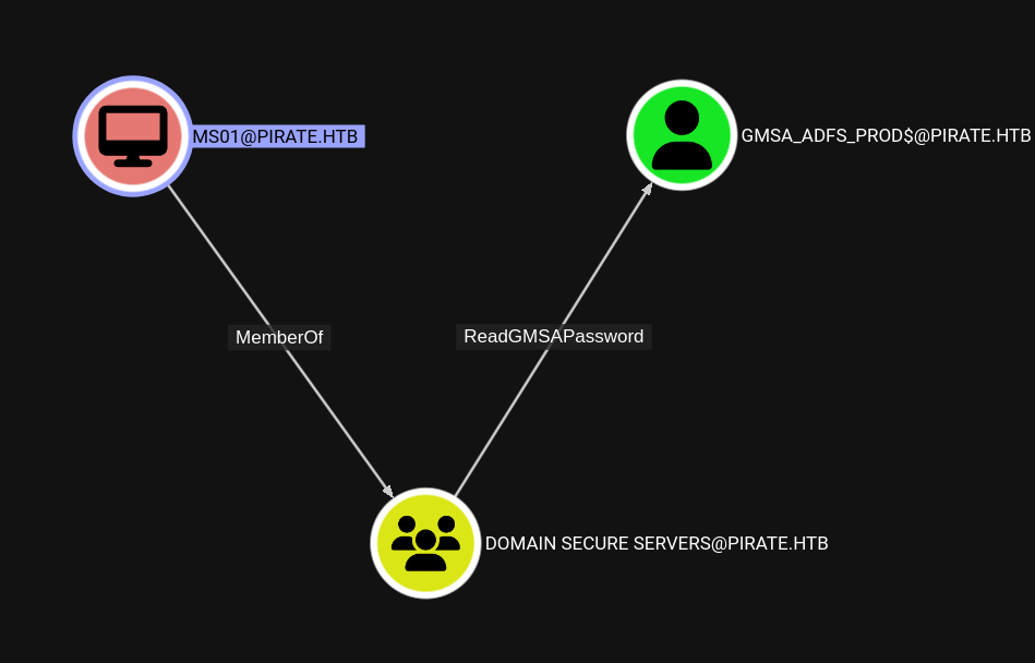 Looking at our bloodhound dump we see that our machine account (MS01$) is a member of DOMAIN SECURE SERVERS, which allows us to read the GMSA password of GMSA_ADFS_PROD$.
